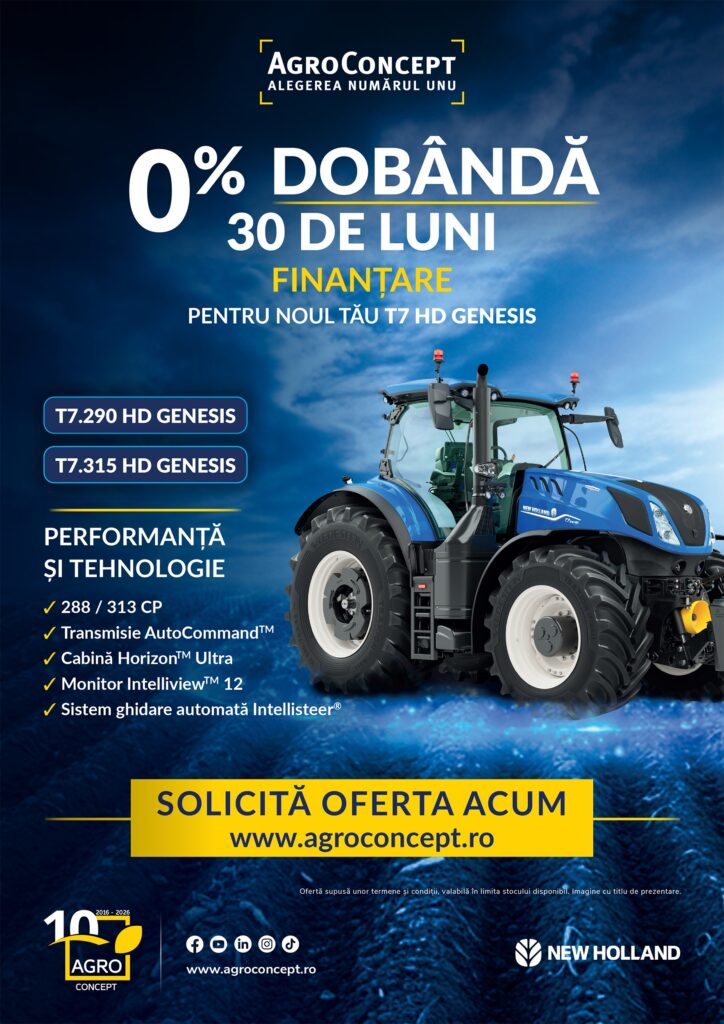 AgroConcept îți aduce o ofertă de finanțare UNICĂ în domeniul agricol, special concepută pentru a-ți transforma ferma într-o afacere de succes. Profită de soluția noastră de neegalat și achiziționează acum un T7 HD GENESIS cu 30 DE LUNI cu DOBÂNDĂ 0%. Astfel, vei reuși să te concentrezi pe dezvoltarea fermei tale fără presiuni financiare imediate!